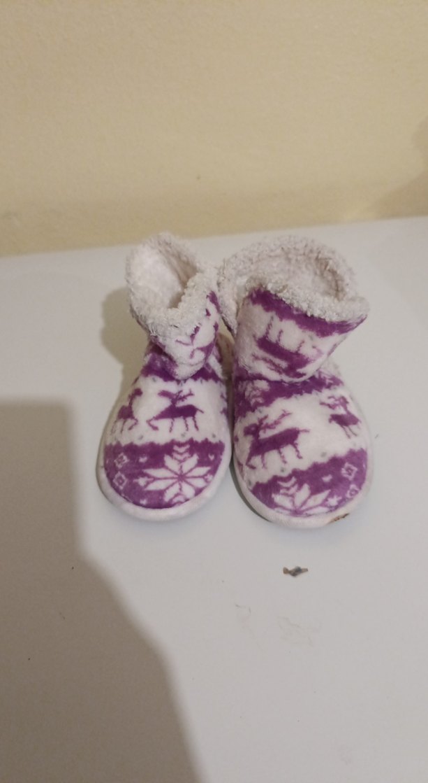 Kız çocukları için örgü ve renkli mor batik desenli, yumuşak ve sıcak astarlı ev terliği. İç mekanlarda rahatlık sağlar.