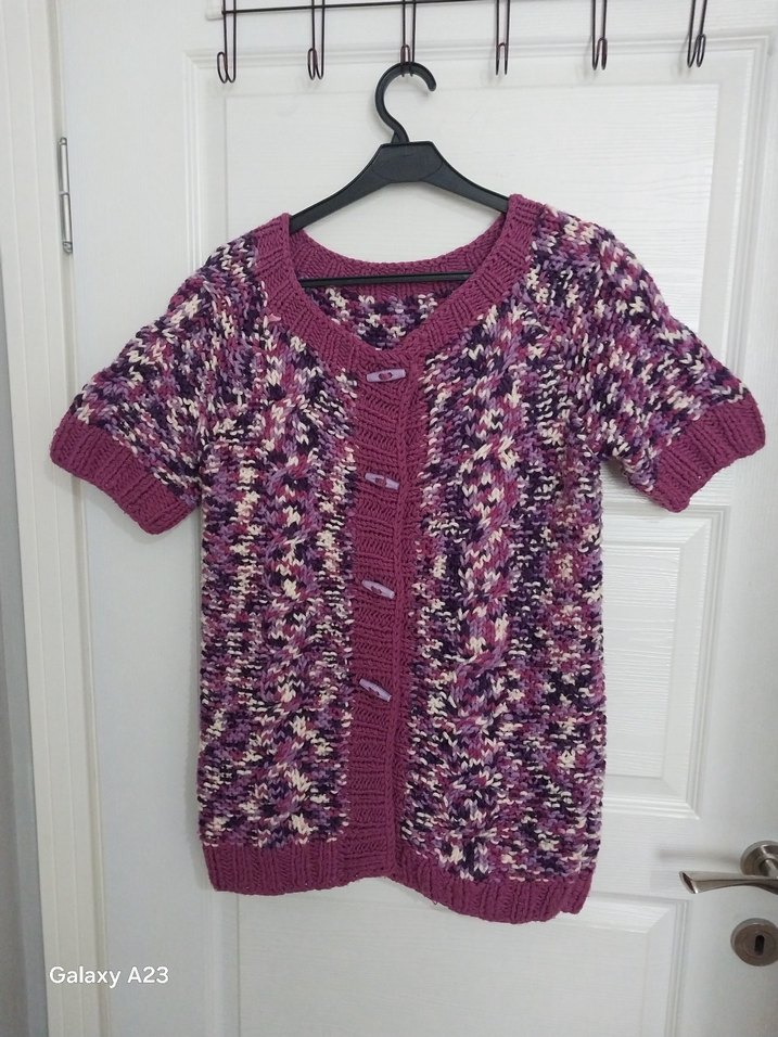 Kısa kollu, bol kesim örgü hırka. Mor ve gri karışımı renklerle çağdaş tarzda kız çocuk hırkası.