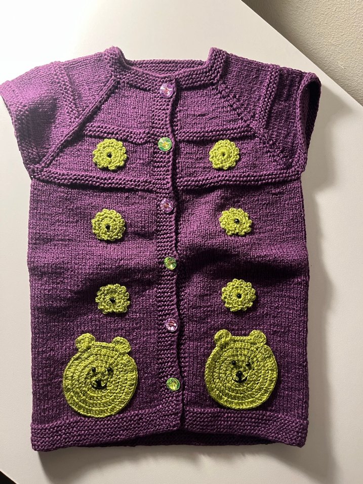 Mor renkli, kolsuz ve fitted kesim örgü kız çocuk hırkası, sarı işlemeli çiçek ve ayı desenleriyle süslenmiştir.