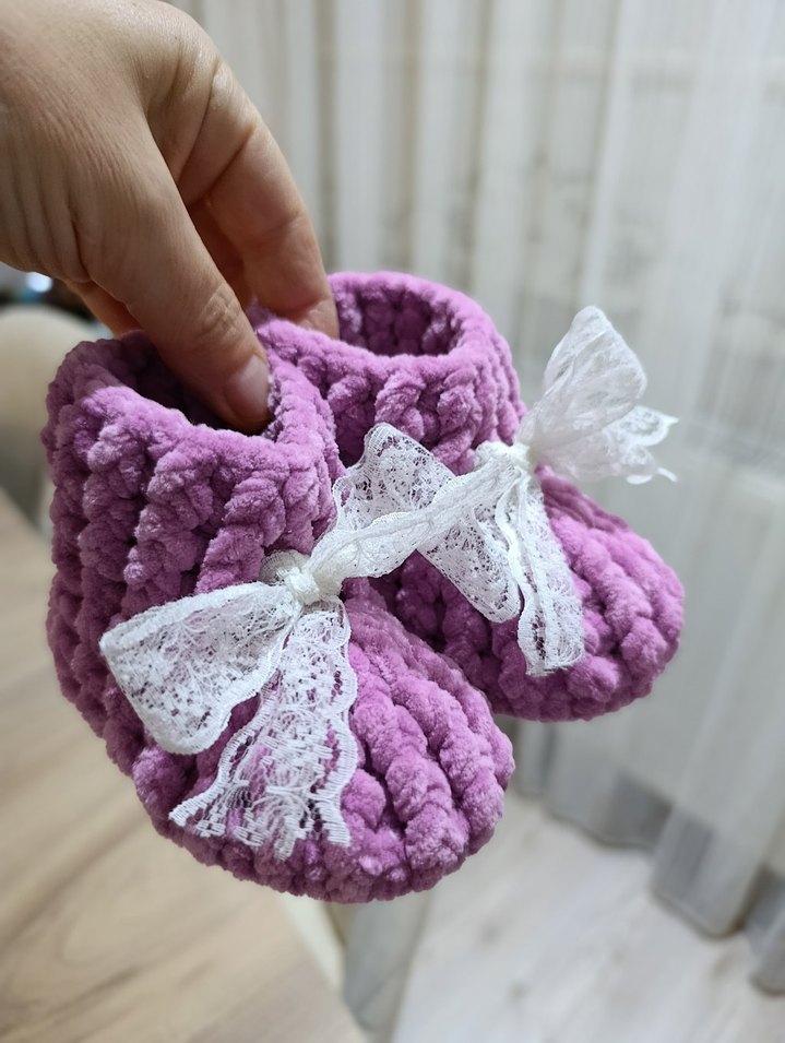 Mor renkli, yumuşak dokulu örgü kız çocuk ev terlikleri, renkli nakış detayları ve beyaz dantel fiyonklarla süslenmiştir.