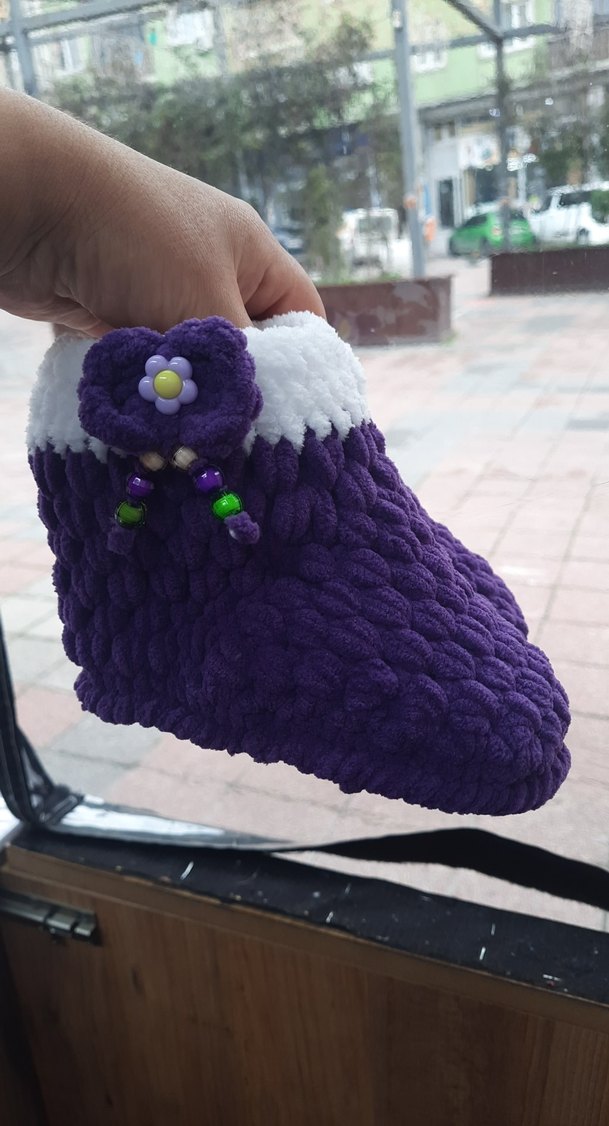 Mor örgü kız çocuk panduf renkli nakış ve beyaz yumuşak manşet ile sıcak tutar. Çiçek ve boncuk detaylar bohem tarzda şıklık katar.