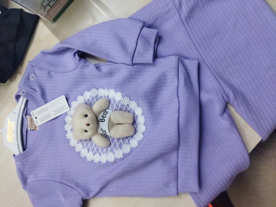 Kız çocuk mor örme dokulu, yumuşak kumaştan sweatshirt. Bisiklet yaka, uzun kollu, bol kesim ve önünde peluş ayıcık detayı bulunur.