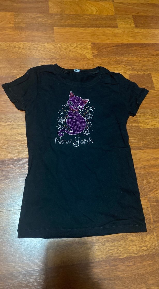 Kısa kollu, fitted kesim kız çocuk tişörtü. Mor payetli kedi ve 'New York' baskılı, sentetik kumaştan yapılmıştır. Trendy ve rahat bir parça.