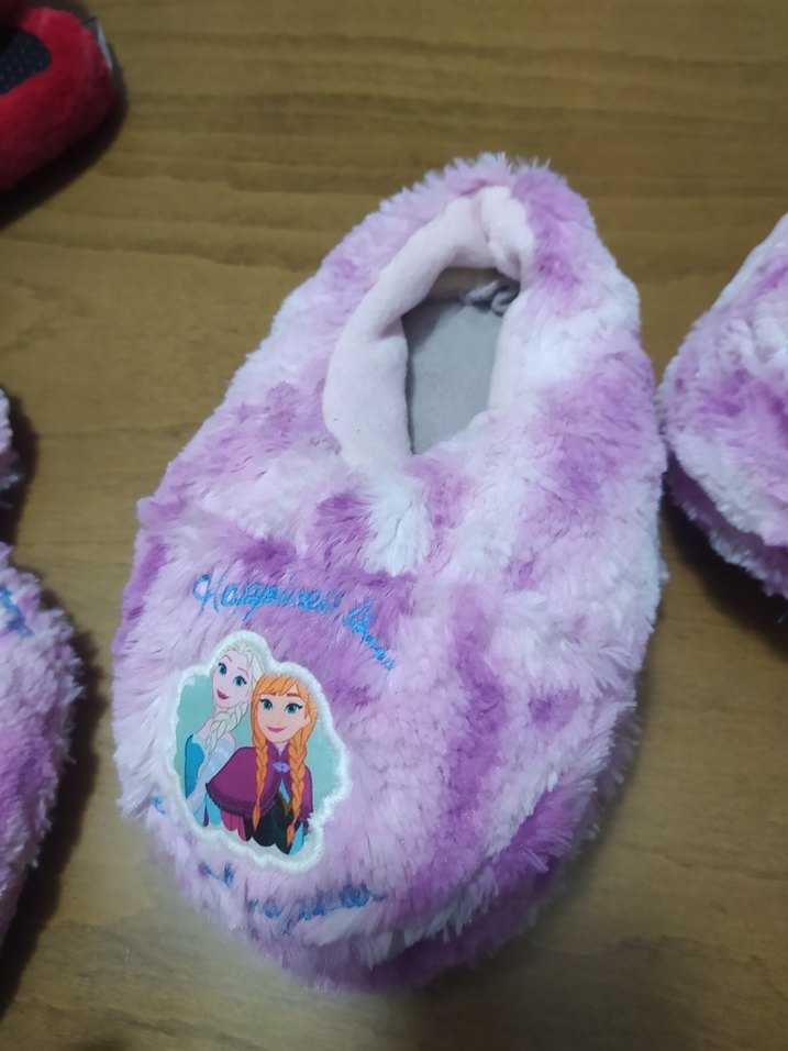Renkli mor, yumuşak kürk detaylı ve baskılı pop kültür desenli kız çocuk terliği. Sıcak ve retro tarz için uygundur. ❄️
