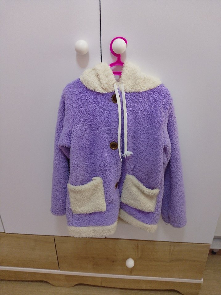Geçişli bol kesim kız çocuk ceketi, kapüşonlu ve pastel mor renkte yumuşak kürk detaylıdır. Rahat ve günlük sokak stili sunar.