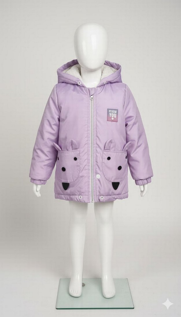 Kız çocuklar için pastel mor renkte, peluş detaylı ve baskılı cepleri olan, kapüşonlu sıcak iç yüzeyli. tertemizdir hiçbir sorunu yoktur
