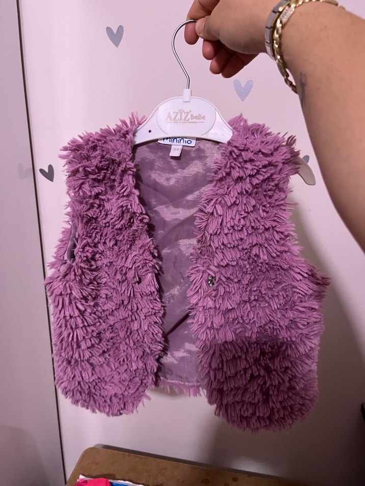 Yana kaydır ikili fiyatıdır.Pastel mor renkte, yumuşak peluş dokulu, V yakalı, kolsuz ve dar kesim kız çocuk yeleği. Diğeri el örgüsüdür