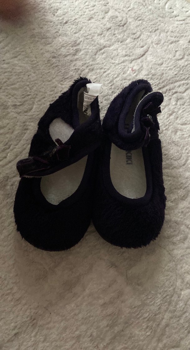 Mor renkli, yumuşak ve sıcak kumaştan yapılmış, cırt cırtlı kız çocuk babet ayakkabısı, sade ve koyu gotik tarzda.