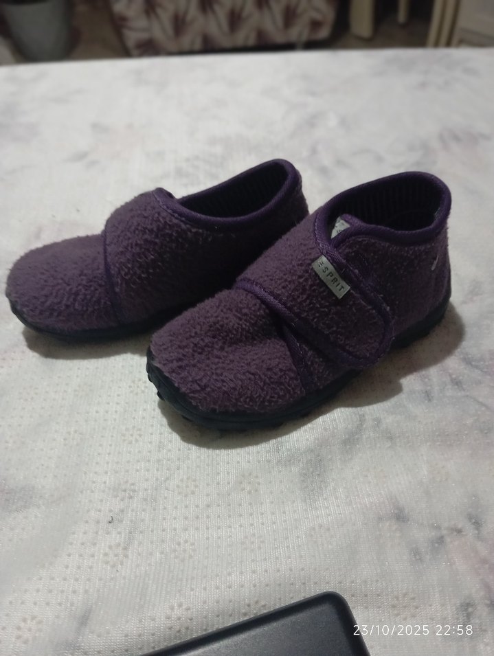 Kız çocuklar için koyu mor polar kumaştan, ayarlanabilir cırt cırtlı, sade ve rahat sıcak terlikler.
