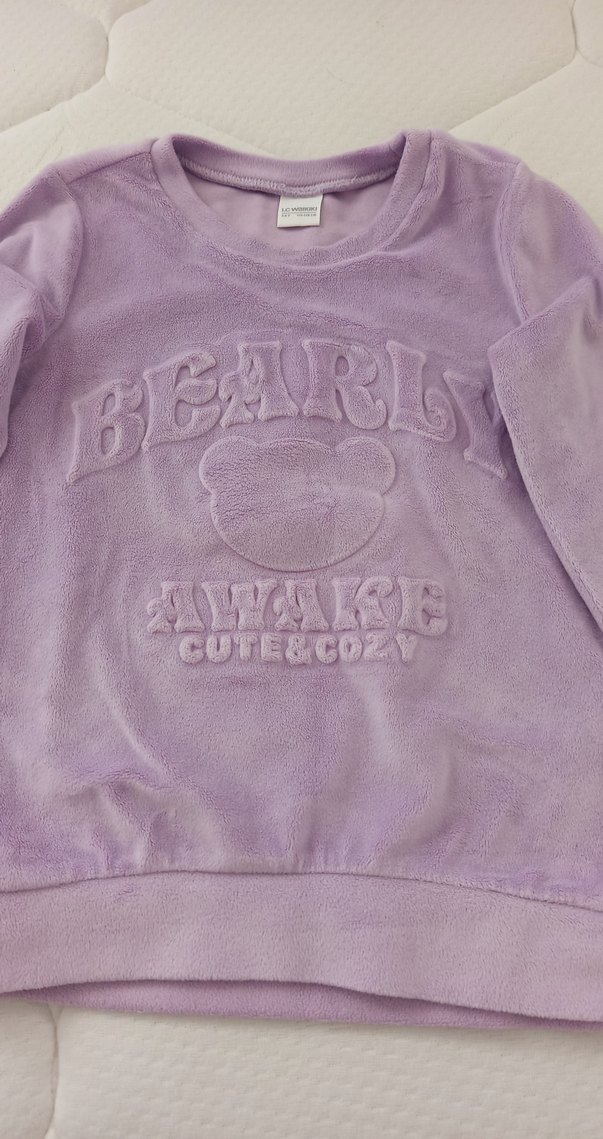 Mor pastel renkte, uzun kollu ve yuvarlak yakalı kız çocuk sweatshirtü. Rahat kesimli, yumuşak ve sıcak kumaştan, düğmeli ve önünde kabartmalı ayı baskısı bulunur. takım