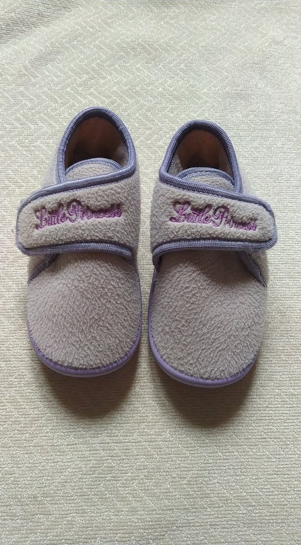 Kız çocukları için pastel mor renkte, yumuşak ve sıcak polar kumaştan yapılmış, nakışlı ve Velcro bantlı terlikler.