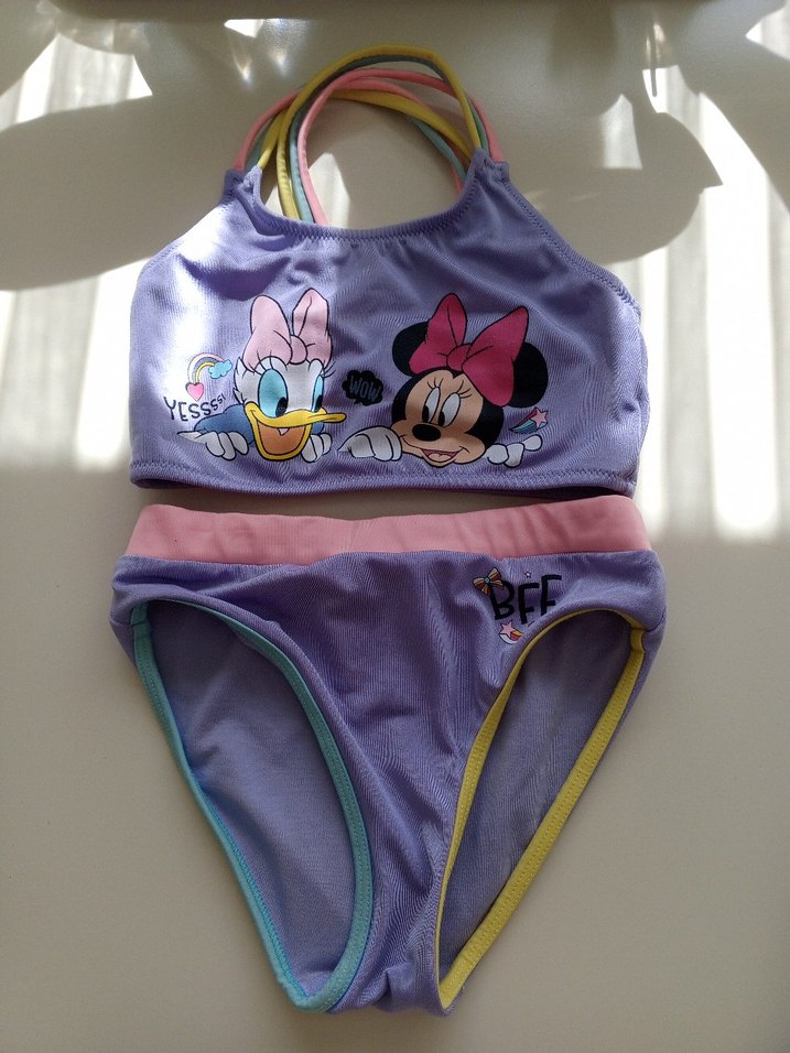 Pastel mor renkte, renkli askılı ve baskılı pop culture figürlü kız çocuk bikini. Alt kısmı kontrast renkli kenarlıklı ve "BFF" baskılıdır.
