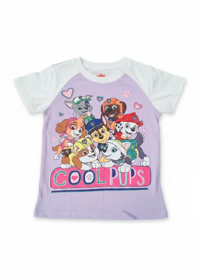 Kız çocuk mor tişört, renkli pop kültür baskılı, kısa kollu ve yuvarlak yaka. Pamuk kumaştan, rahat kesimli ve önünde "COOLPUPS" yazısı bulunur.