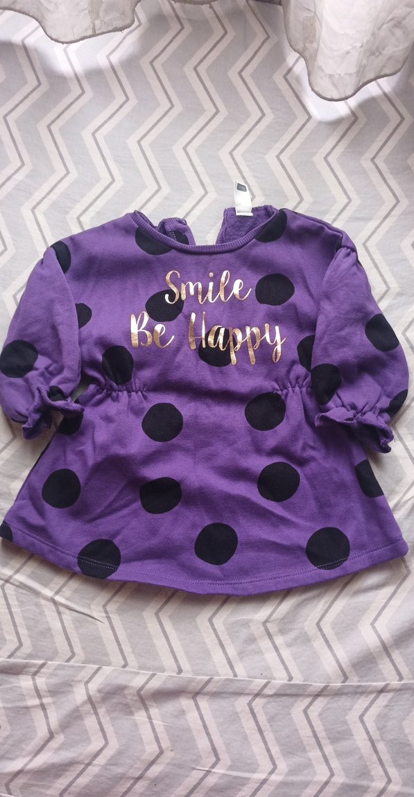 Mor renkli, siyah puantiyeli ve uzun kollu bol kesim elbise. Yuvarlak yaka ve fırfır detayları bulunur. "Smile Be Happy" yazısı vardır. Yumuşak ve sıcak kumaştan üretilmiştir.