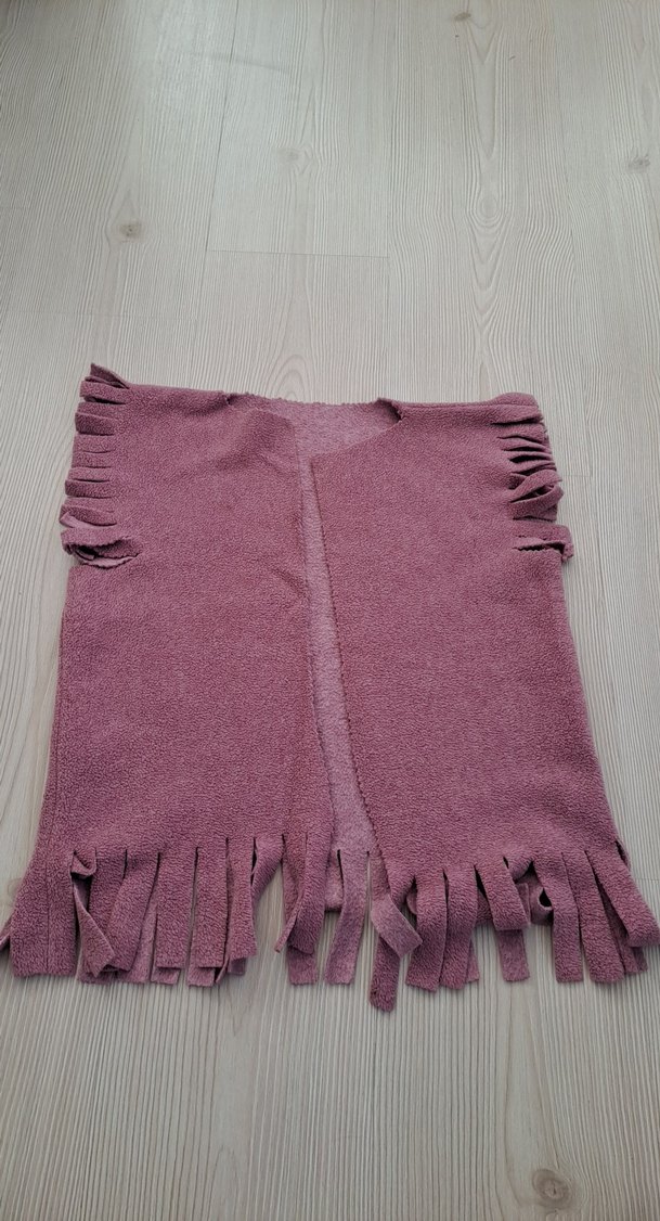 Mor renkli, püsküllü kenarları ve yuvarlak yakası olan, salaş kesim kolsuz panço. Yumuşak ve sıcak dokusu ile bohem tarzına uygun.