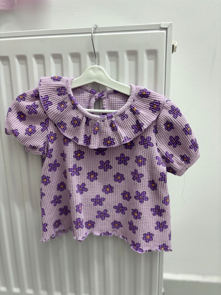 Mor pastel renkte, kısa kollu, fırfırlı yakalı, bol kesim kız çocuk bluzu. Sentetik kumaş üzerinde batik çiçek deseniyle bohem ve retro tarzı yansıtıyor.