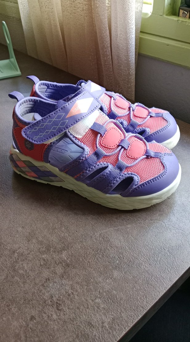 Kız çocukları için mor ve pembe renkli batik desenli, kauçuk tabanlı ve cırt cırtlı spor terlikler, sokak modasına uygun.