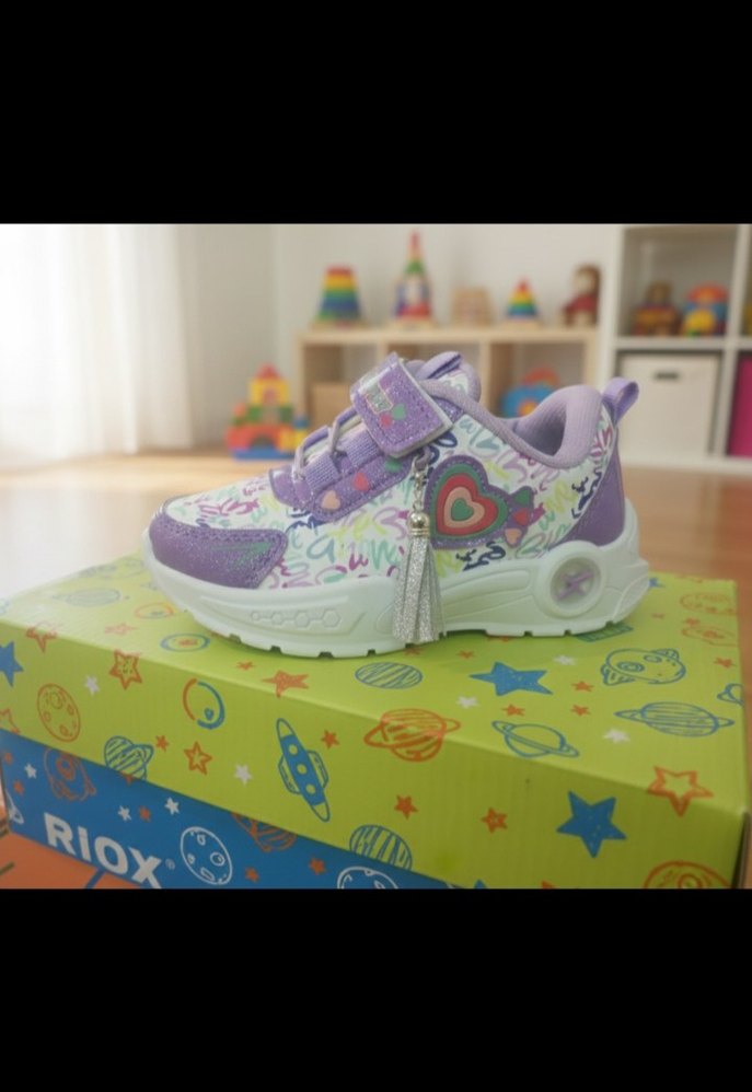 Mor renkli, baskılı desenli kız çocuk spor ayakkabısı. Kauçuk tabanlı, Velcro bantlı ve kalp detaylı, sokak stili için uygun.