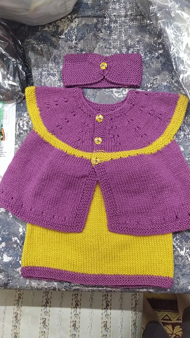 Kız çocuklar için mor renkli sarı detaylı, düğmeli, bohem tarzda, örgü triko takımdır. Kolsuz, fitted kesim ve baş bandı içerir. Bandana ve etek dahil.