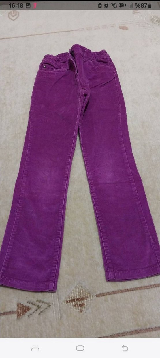Kız çocukları için koyu mor süet kumaştan, düğmeli ve düz desensiz, rahat kesim pantolon.
