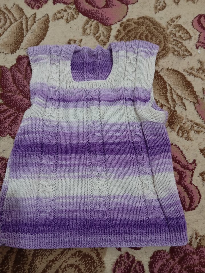 Kız çocukları için mor tonlarında, bağlama desenli, kolsuz, örgü süveter. Oversize ve yuvarlak yakalı.