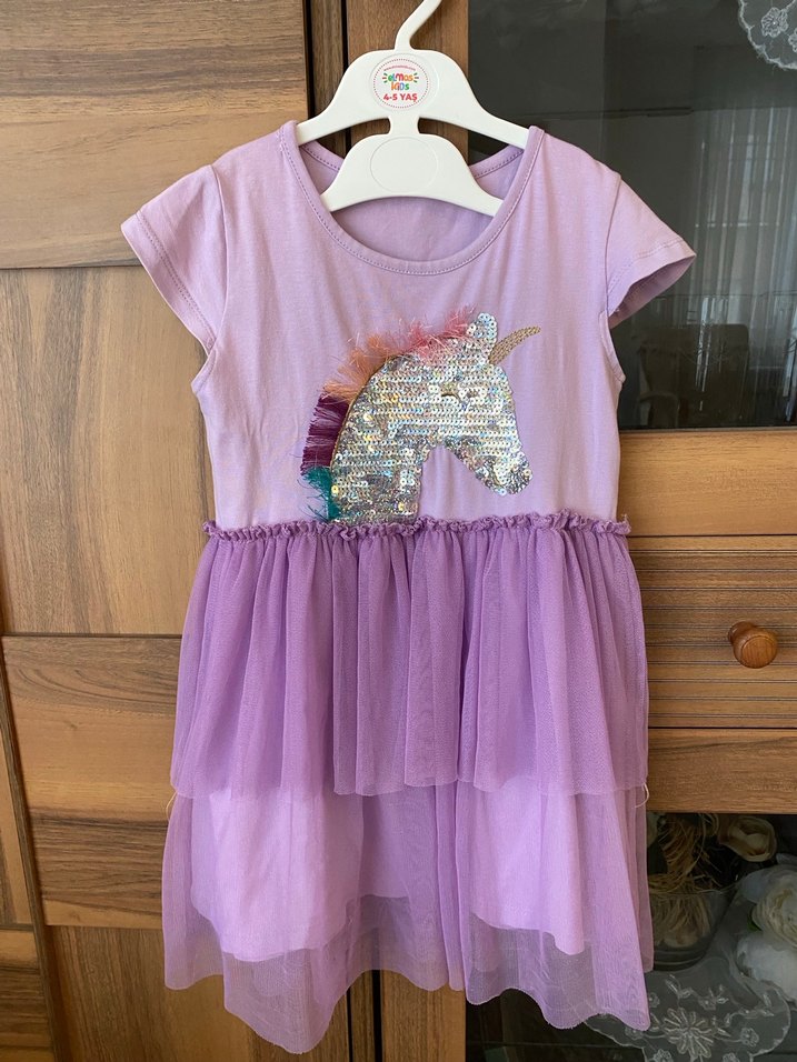 Kız çocuk elbisesi, kısa kollu ve bol kesimli, pastel mor renkte. Payetli unicorn baskı ve kat kat tül fırfır detayları bulunur.