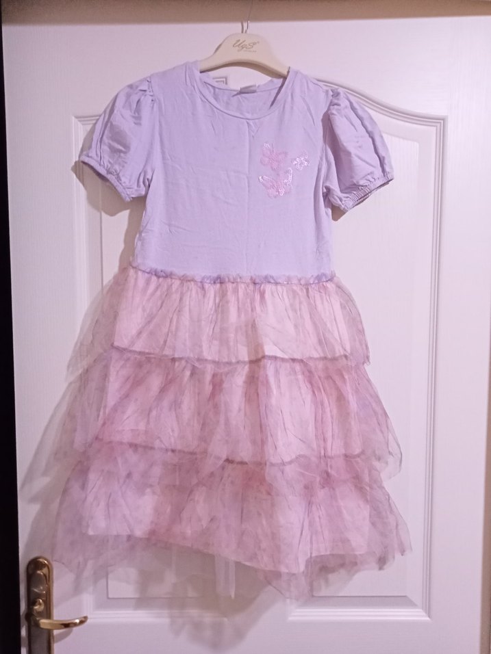 Kız çocuk mor renkte, kısa kollu ve yuvarlak yakalı, bol kesim elbise. Üst kısmı pastel tonlarda, etek kısmı tül katmanlı ve hafif batik desenlidir.