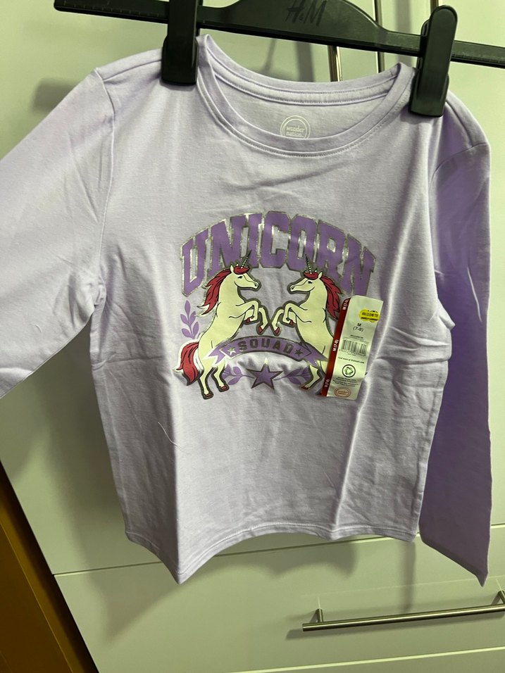 Pamuklu kumaştan, fitted kesim mor uzun kollu tişört, bisiklet yaka ve unicorn baskısı ile dikkat çekiyor.