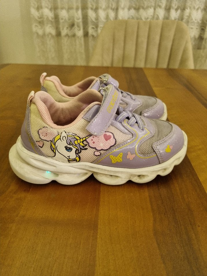 Ortopedik tabanli. Mor renkli, unicorn ve kelebek desenli pastel bağlamalı spor ayakkabılar. Kauçuk taban ve kolay kullanımlı cırt cırtlı bant bulunur. Isiklari kismen yanmaktadir.