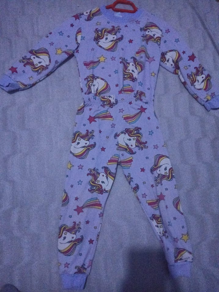 Kız çocukları için uzun kollu, bisiklet yaka ve mor pastel tonlarda unicorn desenli örme kumaştan yapılmış rahat pijama.