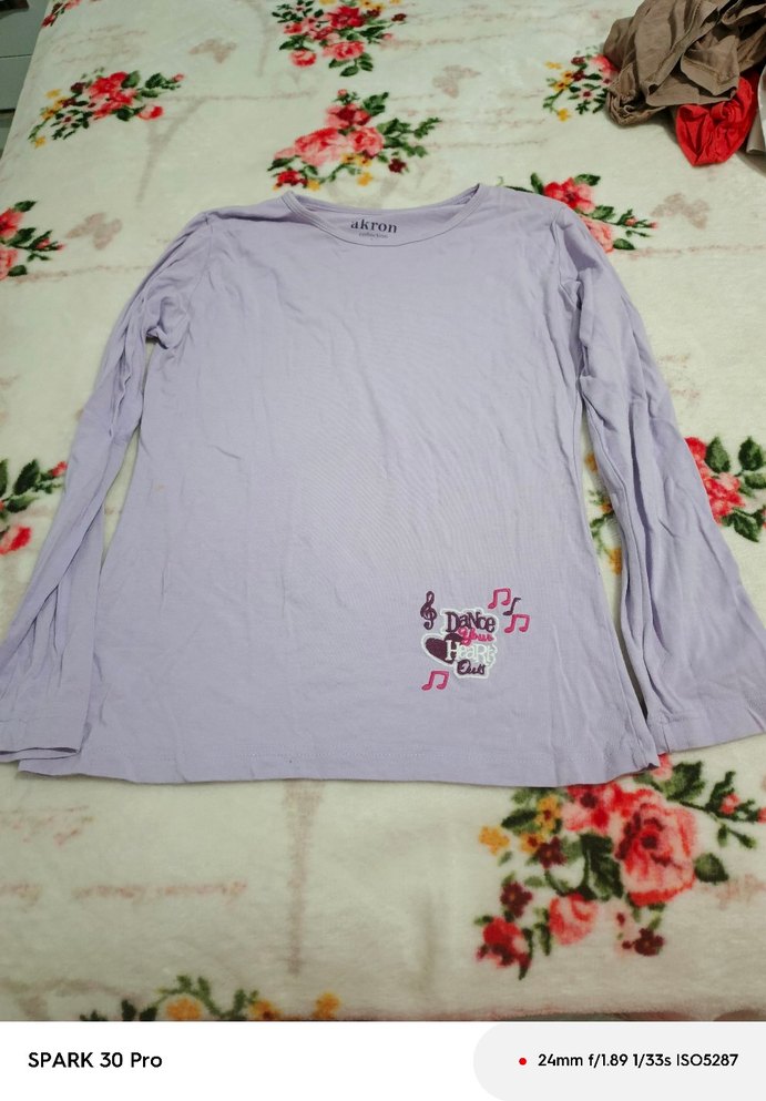 Yumuşak pamuklu, bol kesim mor uzun kollu kız çocuk tişörtü. Etek kısmında düğmeli ve müzik temalı baskı bulunur.
