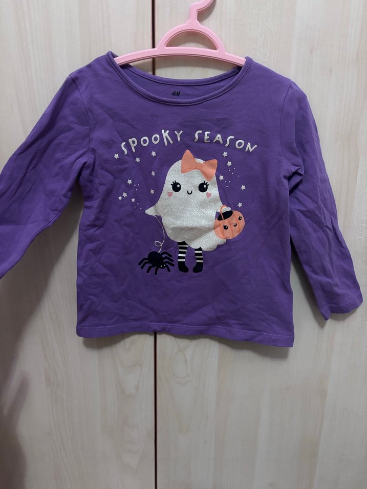 Pamuklu, mor, uzun kollu kız çocuk tişörtü, bisiklet yaka, dantelli ve baskılı sevimli hayalet deseniyle trendy tarz sunar.