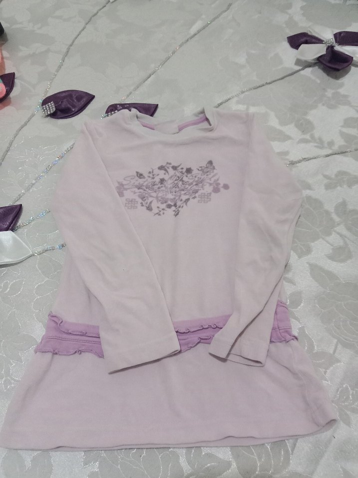 Kız çocuk mor uzun kollu tişört, yuvarlak yaka ve bol kesimlidir. Fırfır detayları ve baskılı çiçek deseni bulunur.