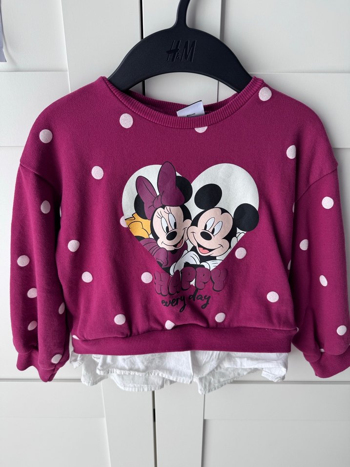 Mor uzun kollu, pamuklu kumaştan yapılmış, bol kesim kız çocuk sweatshirtü. Renkli Mickey ve Minnie baskısı ve fırfır detaylı etek ucu bulunur.