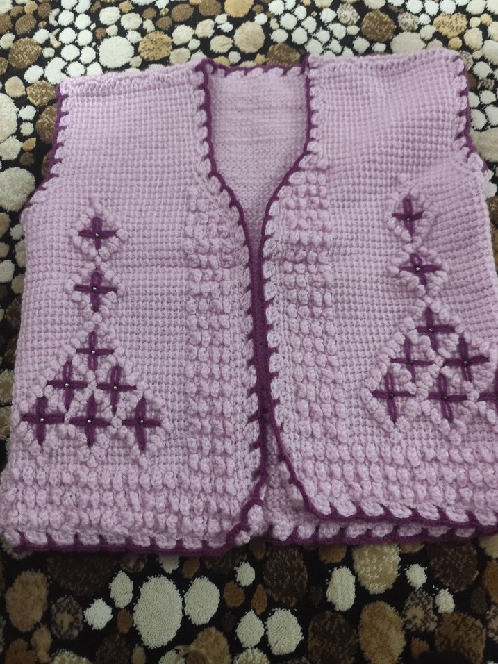 Kız çocuklar için pastel mor renkli, V yakalı, nakışlı örgü süveter. Kolsuz ve normal kesimlidir.
