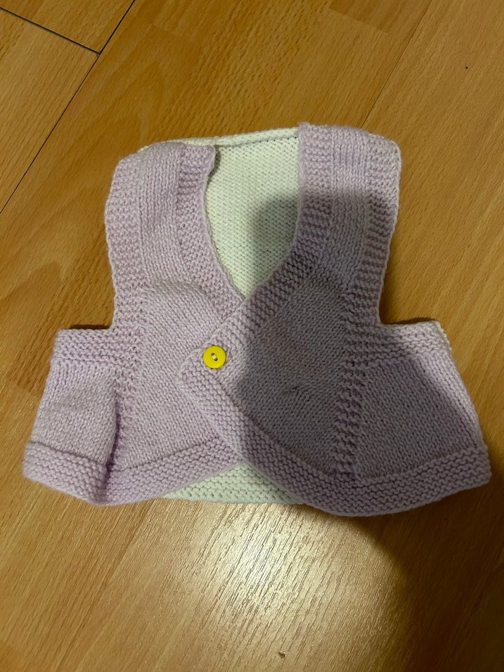 Pastel mor renkte, V yaka, kolsuz kız çocuk örgü süveter. Tek düğmeli, normal kesim ve sade tasarım.