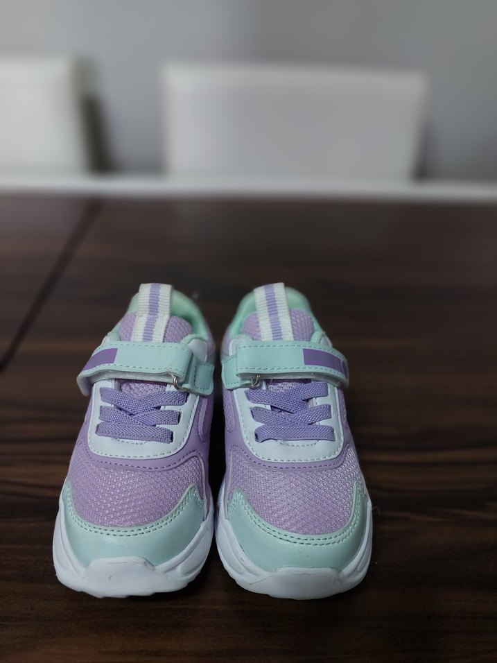 Mor ve pastel tonlarda, bağcık ve cırt cırtlı, bağcıklı ve bağcık detaylı, lastik tabanlı kız çocuk spor ayakkabısı.