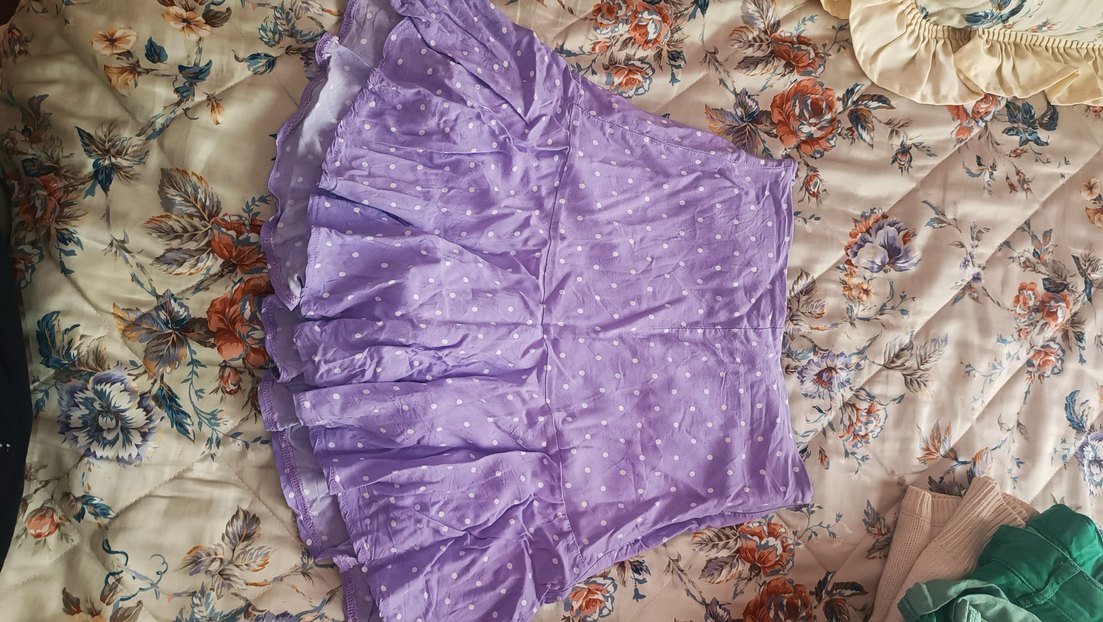 Yumuşak sentetik kumaştan, volan detaylı, bol kesim mor etek. Parlak yüzeye sahip ve bohem tarzda.