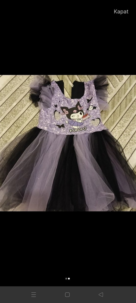 Mor ve siyah katmanlı, straplez yaka ve kolsuz, vücuda oturan kız çocuk elbisesi. Önü baskılı ve dantelli, punk rock havası verir.