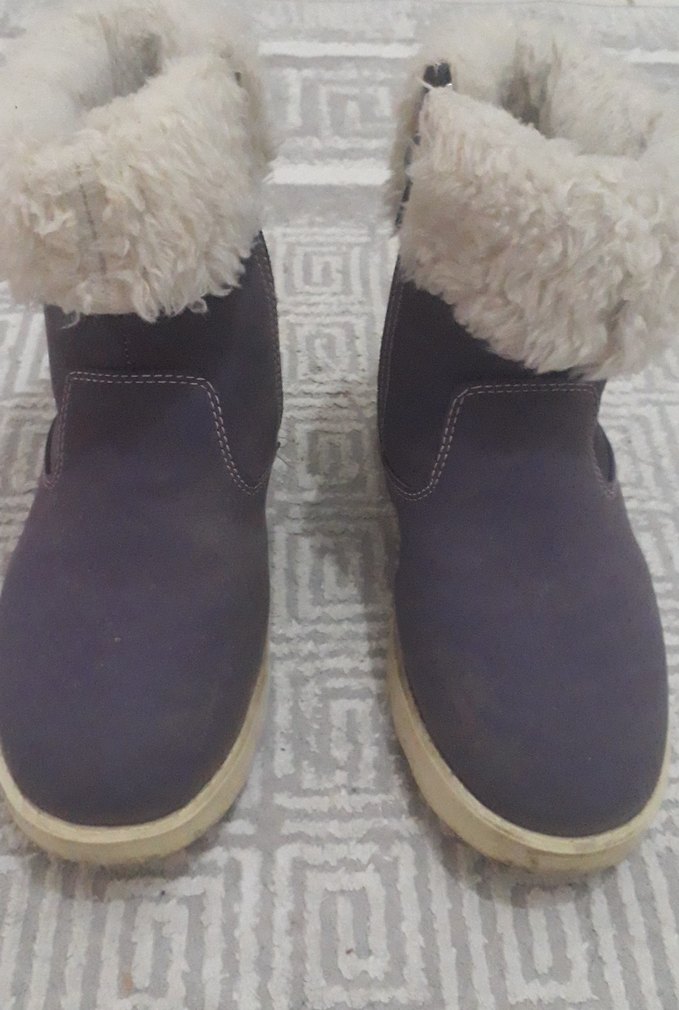 Kız çocukları için kahverengi süet malzemeden yapılmış, mori tonlarda ve yumuşak kürklü astarlı, trendi gündelik ve karşı kültür tarzında botlar.