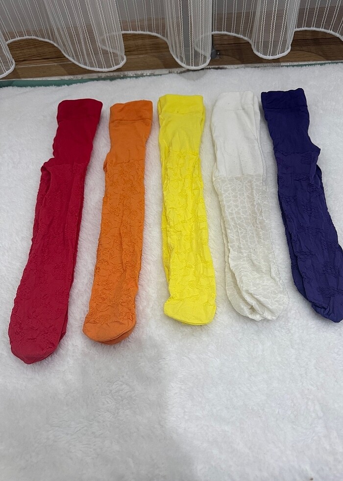 Sadece krem olanı giydirdim diğerleri yenidir 5 adet kırmızı turuncu sarı krem mor külotlu çorap fiyatıdır sorunu yoktur bebekten bebeğe farkeder 3-6-9 aya kadar uyumlu esnek yapısı var