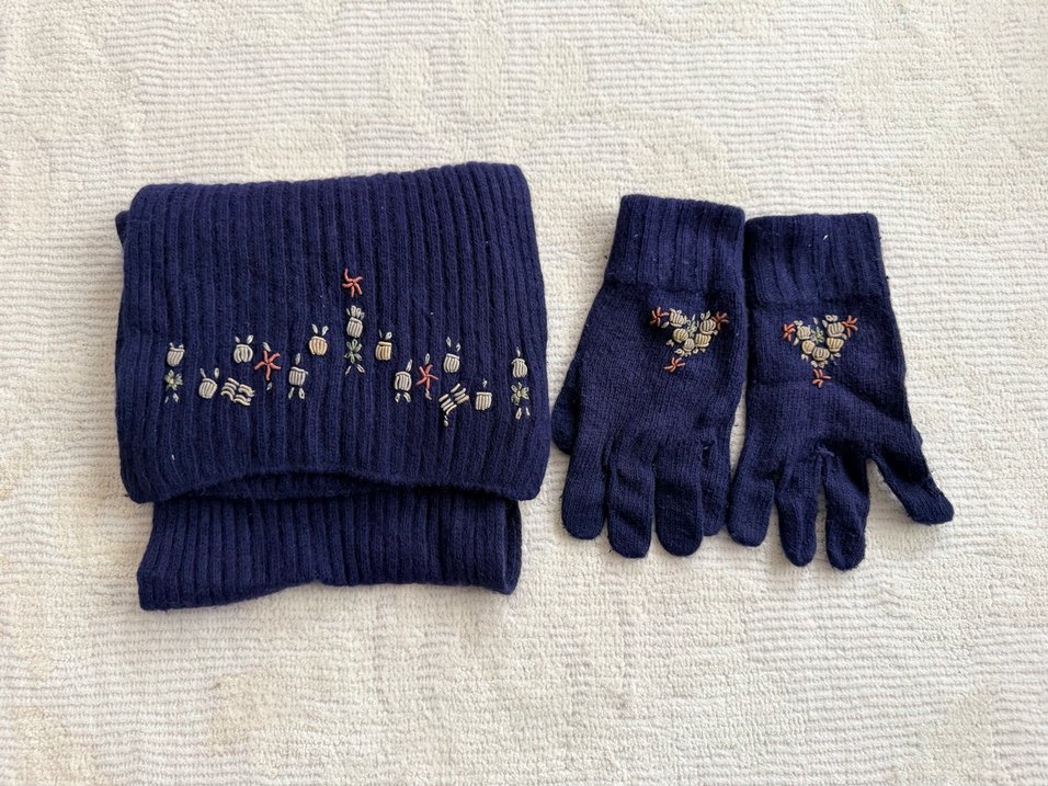 Koyu mavi eldiven ve atkı takımı, nakışlı çiçek desenleriyle bohem tarzda, yumuşak ve rahat kumaştan yapılmıştır.
