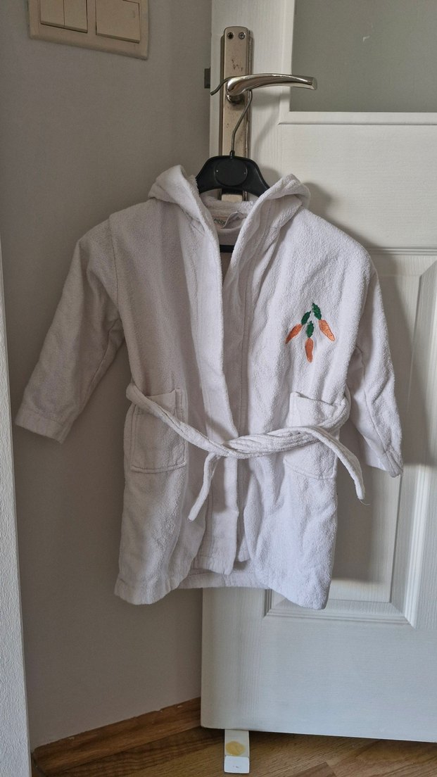 Yumuşak ve sıcak kumaştan yapılmış, kapüşonlu kız çocuk beyaz bornoz. Nakışlı detayları, kemeri ve ön cepleri bulunur. 3-5 yaş arası çok iyi durumda.