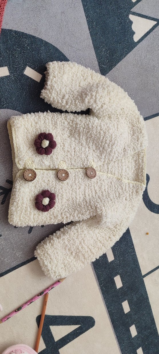 Kız çocukları için bohem tarzda, düğmeli ve uzun kollu, yumuşak örme kumaştan yapılmış, nakışlı çiçek detaylı beyaz hırka. kızıma ördüm giyemedi şimdi dar geliyor