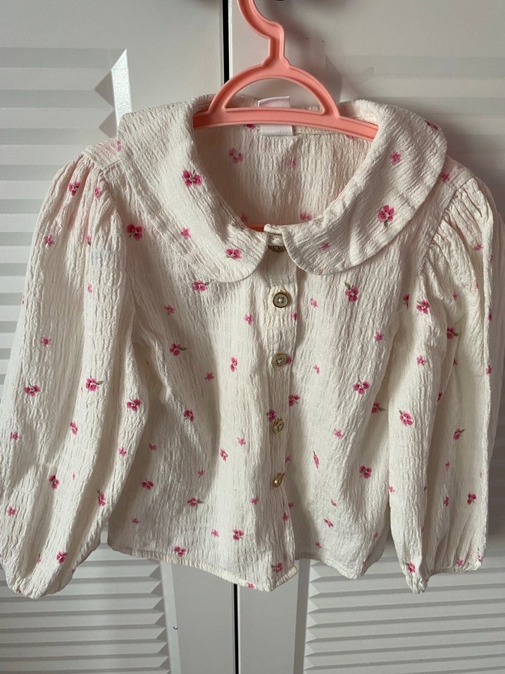 Uzun kollu, düğmeli beyaz keten kız çocuk gömleği. Geniş yakalı, bol kesim ve pembe çiçek nakışlı, bohem tarzı için uygun.