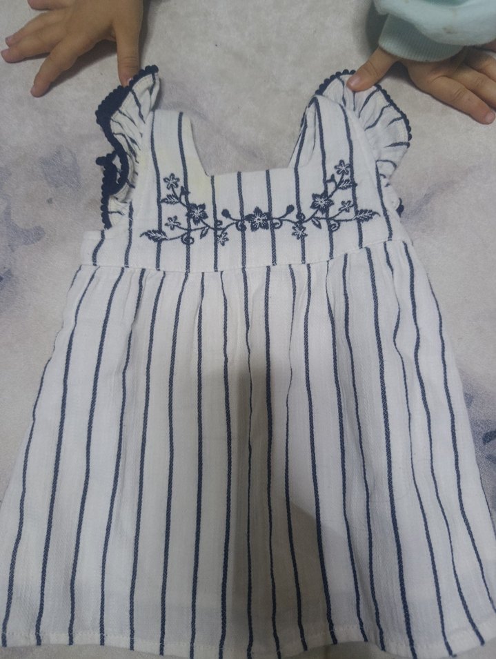 Kolsuz, askılıksız beyaz kumaştan yapılmış, nakışlı ve fırfırlı kollara sahip bol kesim kız çocuk elbisesi.