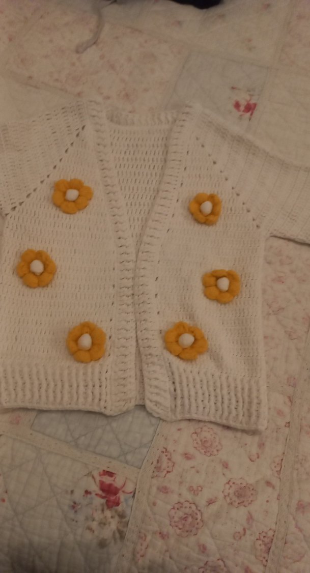 Uzun kollu, bol kesim beyaz örgü kız çocuk hırkası, nakışlı sarı çiçek detaylarıyla bohem tarzında.
