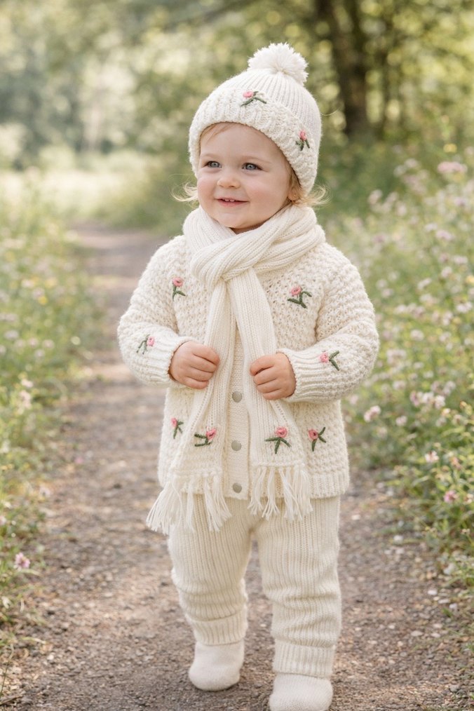 Nakışlı çiçek desenli beyaz triko kız çocuk takımı; uzun kollu hırka, pantolon, atkı ve bere içerir. Rahat kesim ve yumuşak dokuda. Annem kızımın çeyizine aldı ama hiç giydirmedim yepyeni sadece sakladığım yerde sarı küçük bir leke oluşmuş cekette yıkanınca geçer