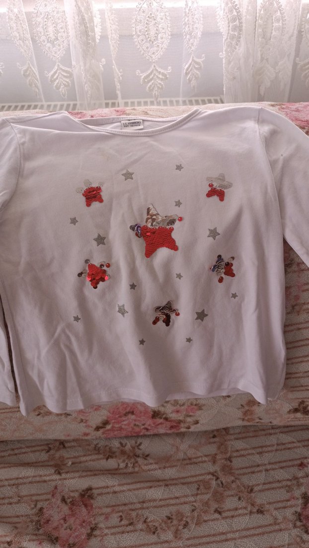 Nakışlı yıldız desenli, düğmeli, beyaz uzun kollu kız çocuk tişörtü. Yuvarlak yakalı ve rahat kesimlidir, streetwear tarzına uygundur.