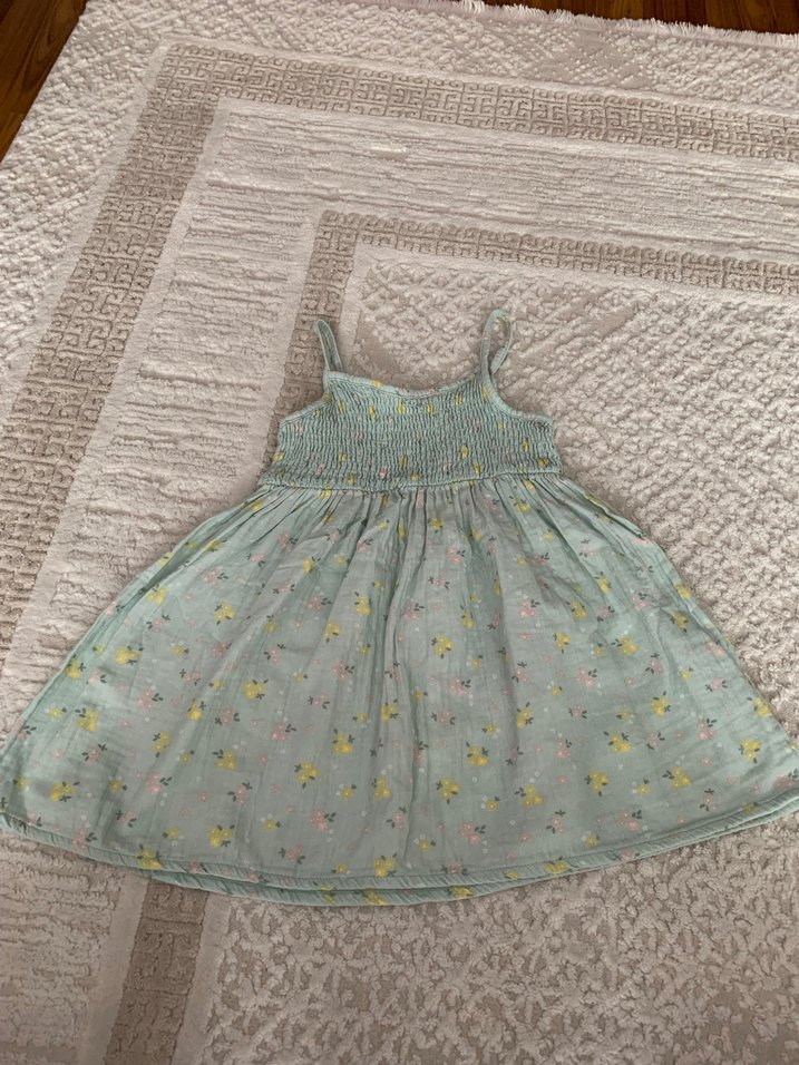 Nakışlı, pastel renkli, pamuklu kumaştan, kolsuz, straplez bohem kız çocuk elbisesi. Bol kesimli ve fırfır detaylıdır. Müslüm kumaş